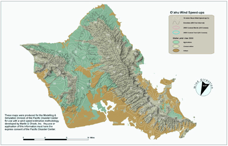 | These products are intended for and should only be used by weather forecasters or meteorologists. The products show the influence of terrain on amplifying the winds. The amplified winds or wind speed-up factors are expressed as percents. To determine the actual winds or potential wind damage from a tropical cyclone would require linking the wind speed-up information to a windfield model. |